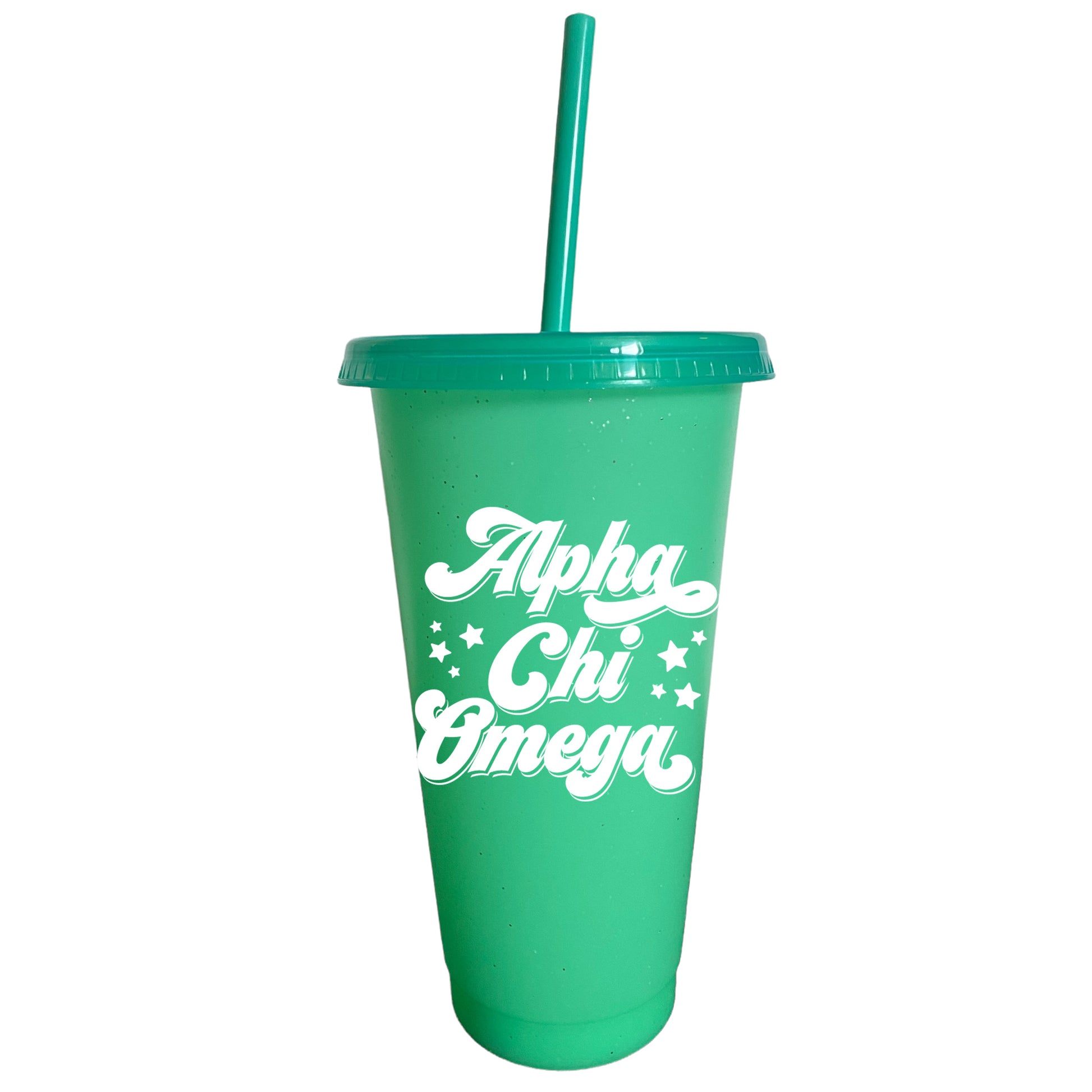 Take your sorority spirit on the road with our Set of 4 Glitter Color Changing Cups. Our 24-ounce reusable cups are made of magic! Each one changes color when filled with ice or your favorite cold beverage. Each package contains 4 Cups, 4 Lids, and 4 Straws. Each Cup has been screen printed with your sorority name in a cool Retro font. BPA Free.