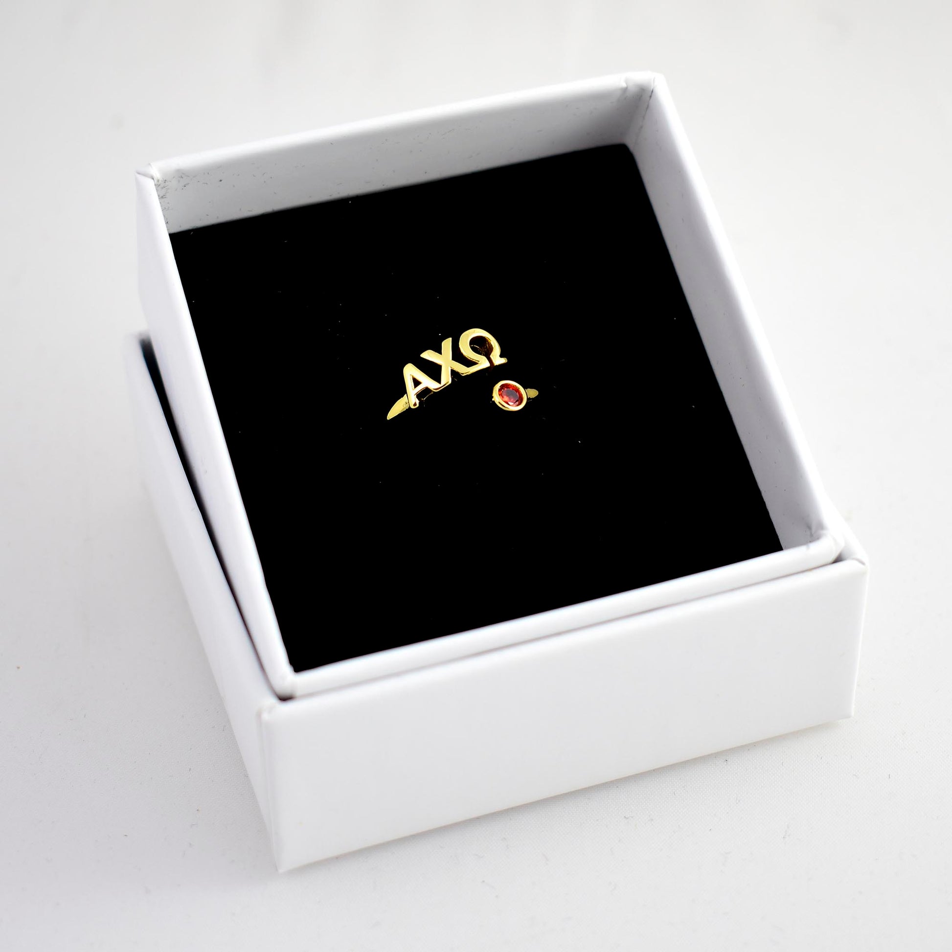 - SORORITY GREEK LETTER RING - Sorority pride is in the air! Show off your Alpha Chi Omega sisterhood with this personalized wraparound ring. Proudly showing your Greek letters, plated in 18k gold and including a beautiful colored gemstone, they're perfect for continued wear at home or on campus.