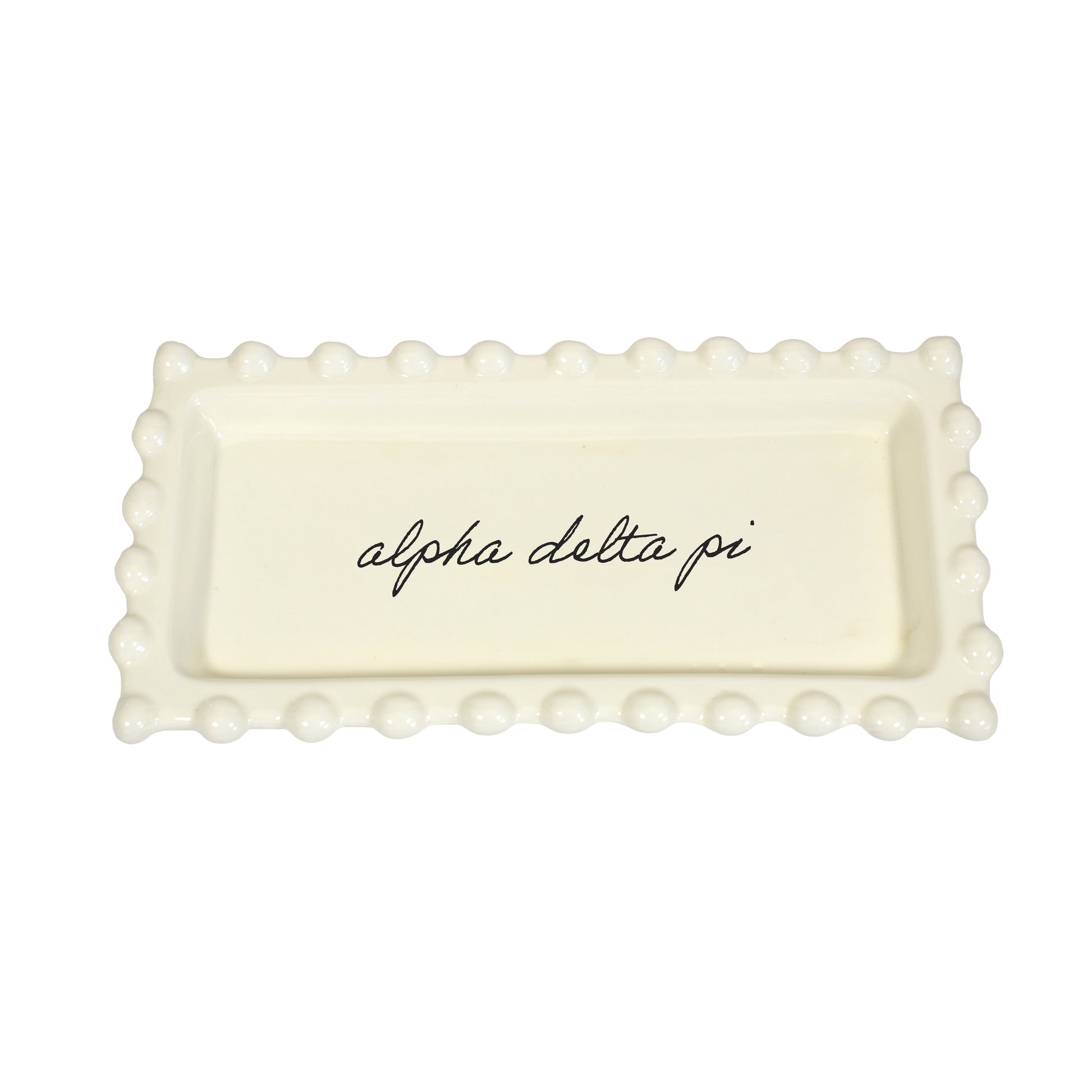- SORORITY NAME IN CURSIVE SCRIPT: This Alpha Delta Pi jewelry dish boasts an attractive monochromatic look, proudly displaying your sorority name in cursive script.
