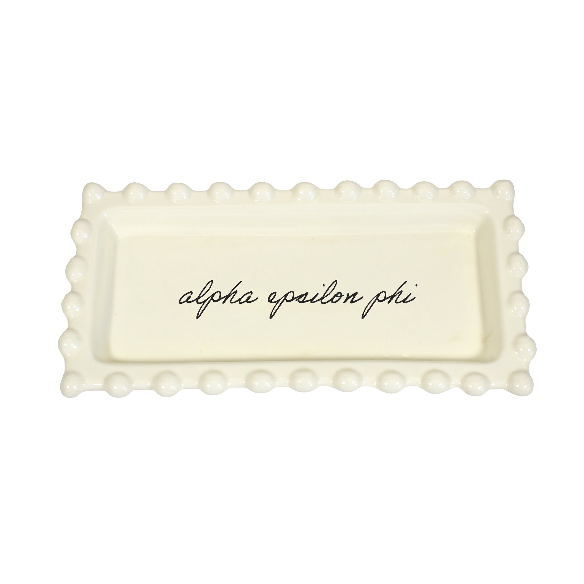 - SORORITY NAME IN CURSIVE SCRIPT: This Alpha Epsilon Phi jewelry dish boasts an attractive monochromatic look, proudly displaying your sorority name in cursive script.