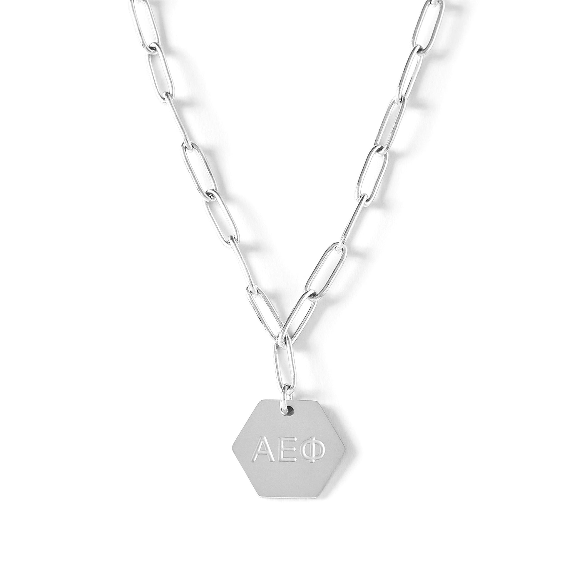 The perfect gift of Sisterhood! Our Alpha Epsilon Phi Necklace features your sorority's Greek letters on a 15mm hexagon shaped pendant, with a paperclip style chain, all dipped in silver! Perfect for a bid day gift, big little gift or a treat for yourself!