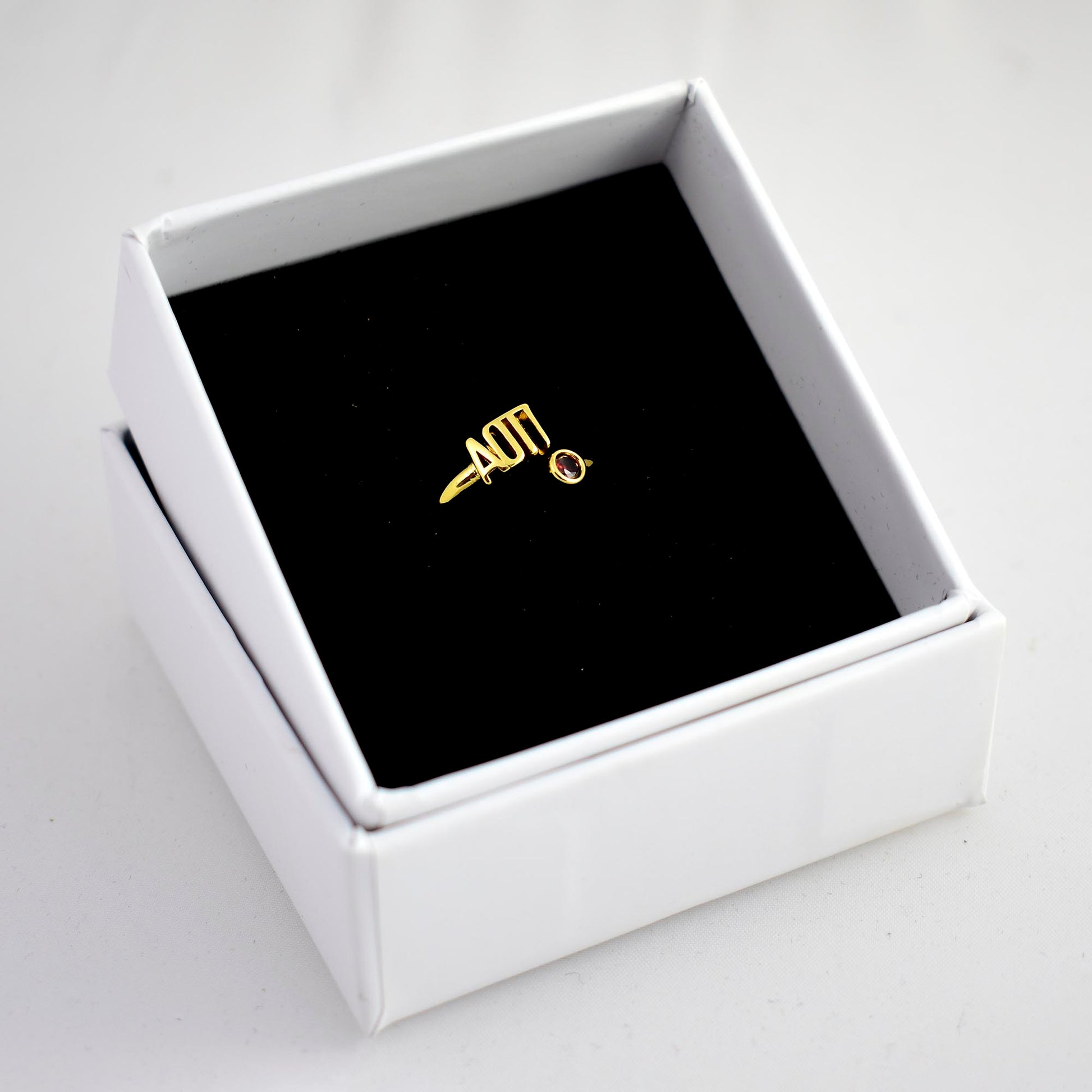 - SORORITY GREEK LETTER RING - Sorority pride is in the air! Show off your Alpha Omicron Pi sisterhood with this personalized wraparound ring. Proudly showing your Greek letters, plated in 18k gold and including a beautiful colored gemstone, they're perfect for continued wear at home or on campus.