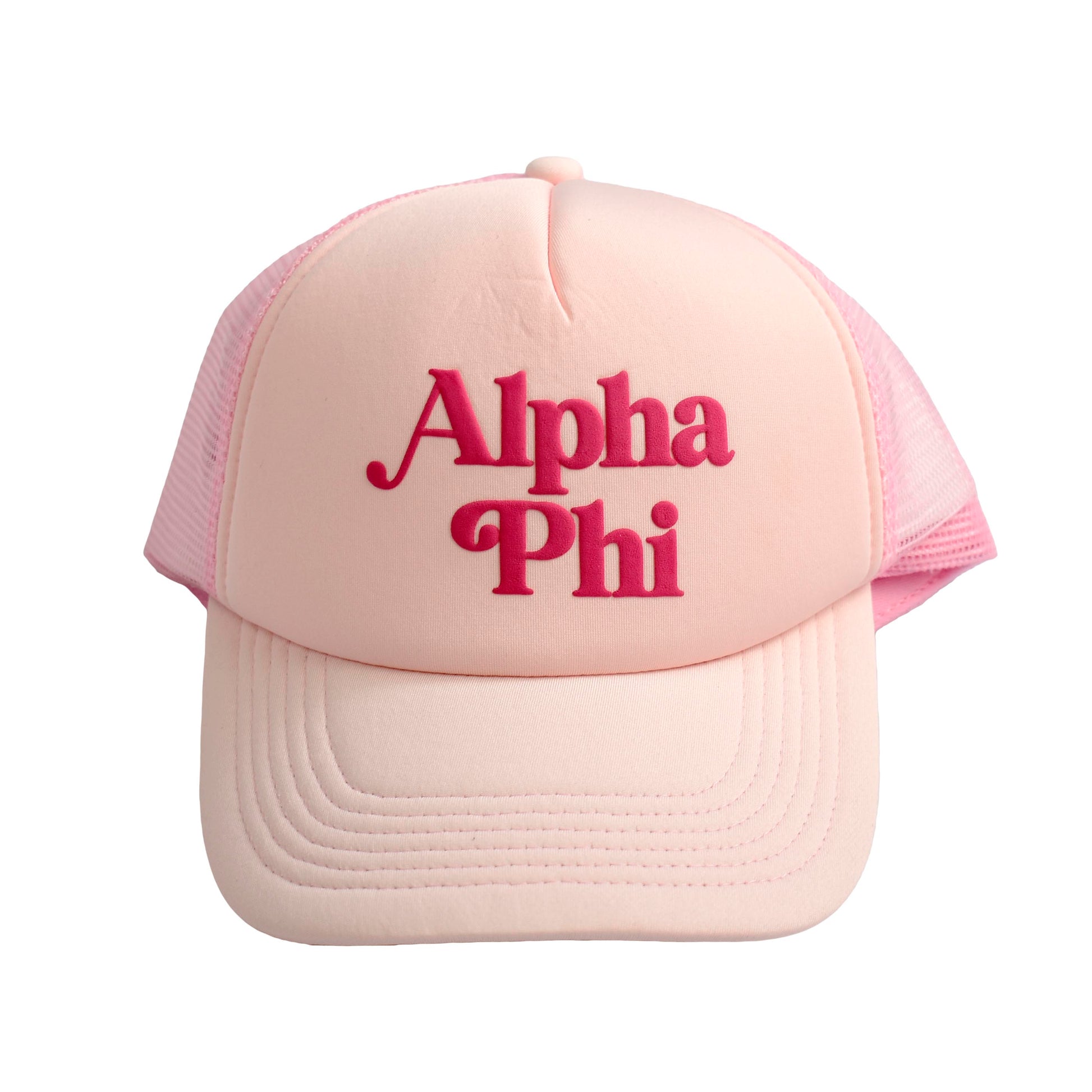 Sorority Shop proudly presents their Alpha Phi Trucker-Style Baseball Hat, providing a casual and cool look for all seasons.