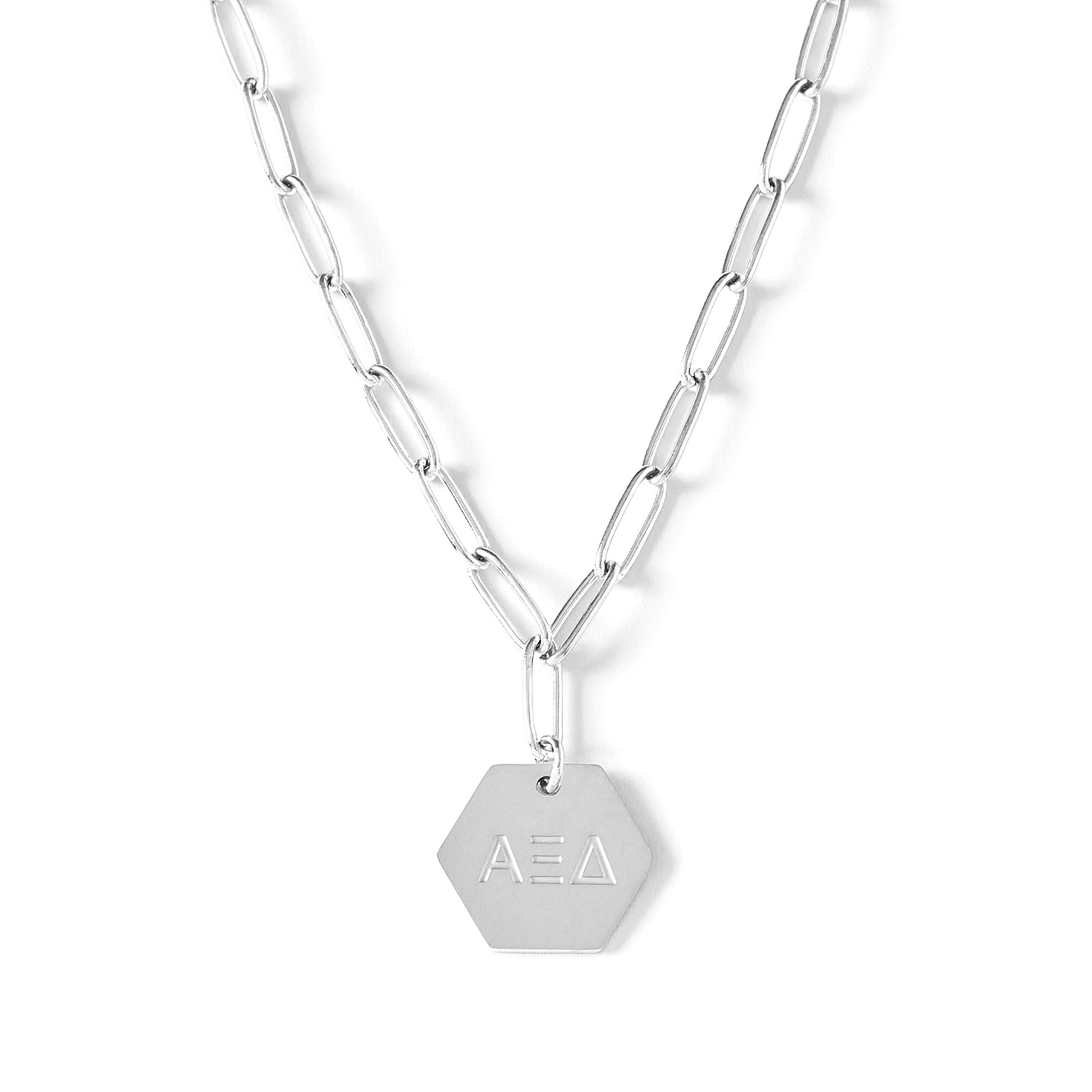 The perfect gift of Sisterhood! Our Alpha Xi Delta Necklace features your sorority's Greek letters on a 15mm hexagon shaped pendant, with a paperclip style chain, all dipped in silver! Perfect for a bid day gift, big little gift or a treat for yourself!