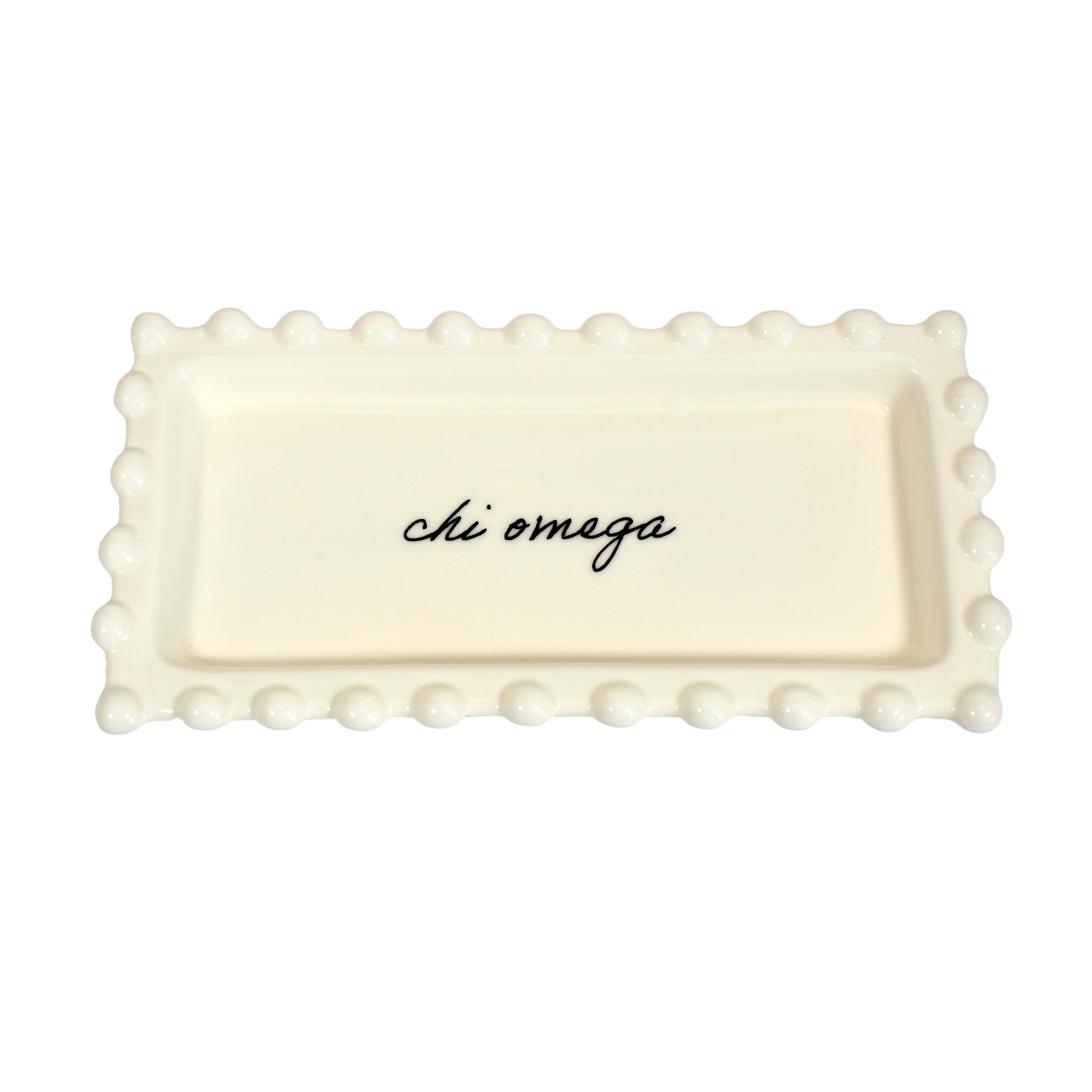 - SORORITY NAME IN CURSIVE SCRIPT: This Chi Omega jewelry dish boasts an attractive monochromatic look, proudly displaying your sorority name in cursive script.