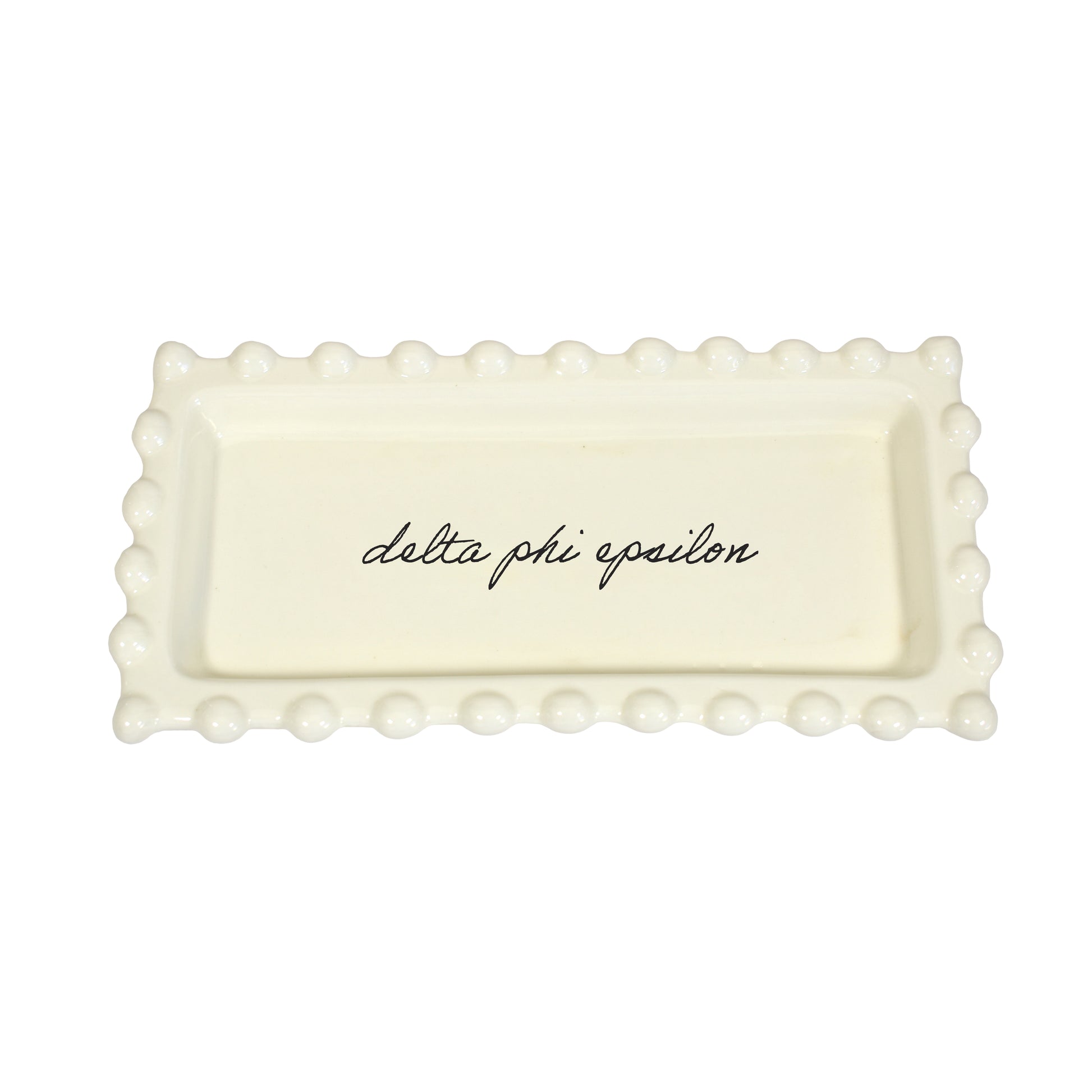 - SORORITY NAME IN CURSIVE SCRIPT: This Delta Phi Epsilon jewelry dish boasts an attractive monochromatic look, proudly displaying your sorority name in cursive script.