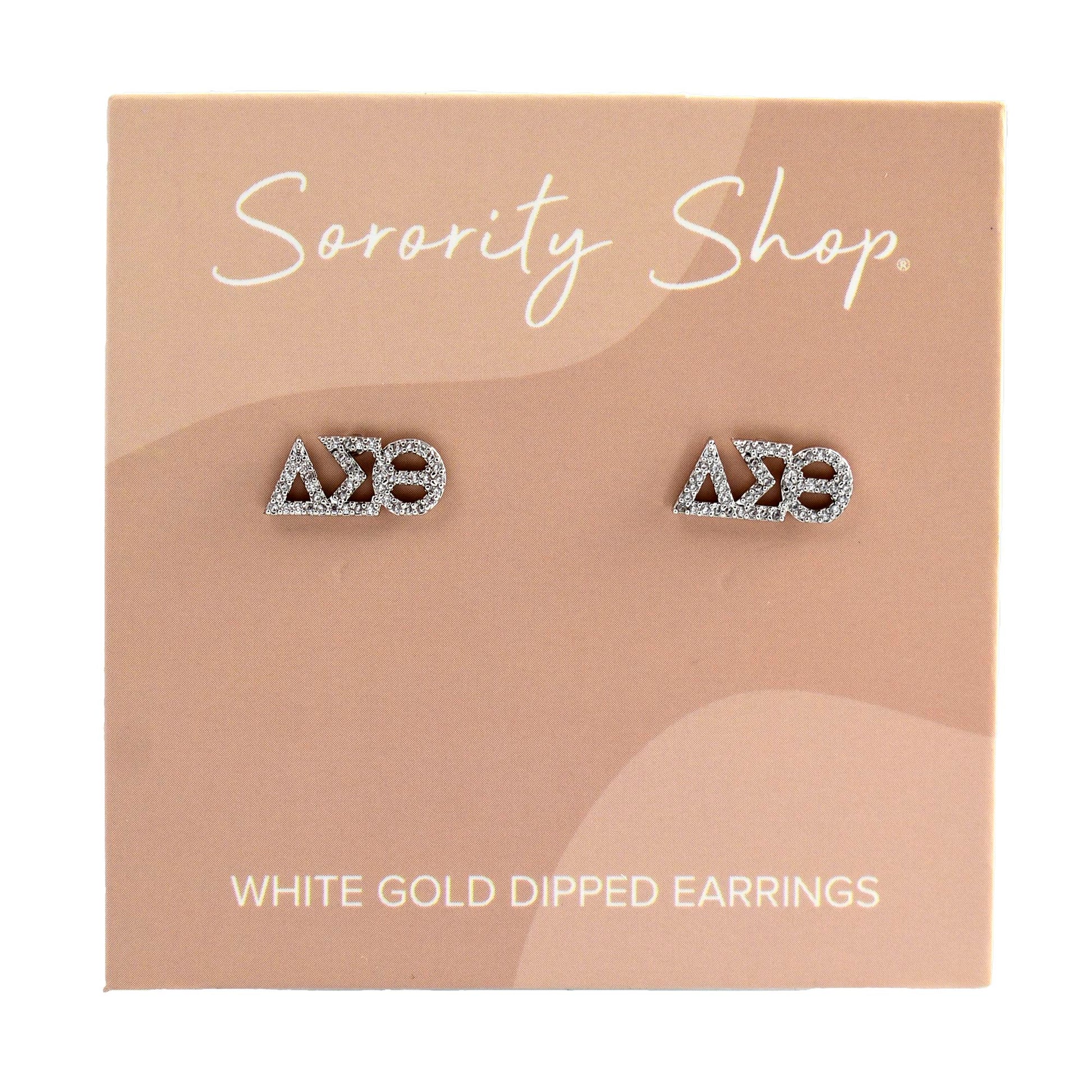- STUD EARRING DESIGN – Our white gold-dipped Delta Sigma Theta earrings are designed to make a statement. The Cubic Zirconia (CZ) studded sorority Greek letter earrings provide a unique look.
