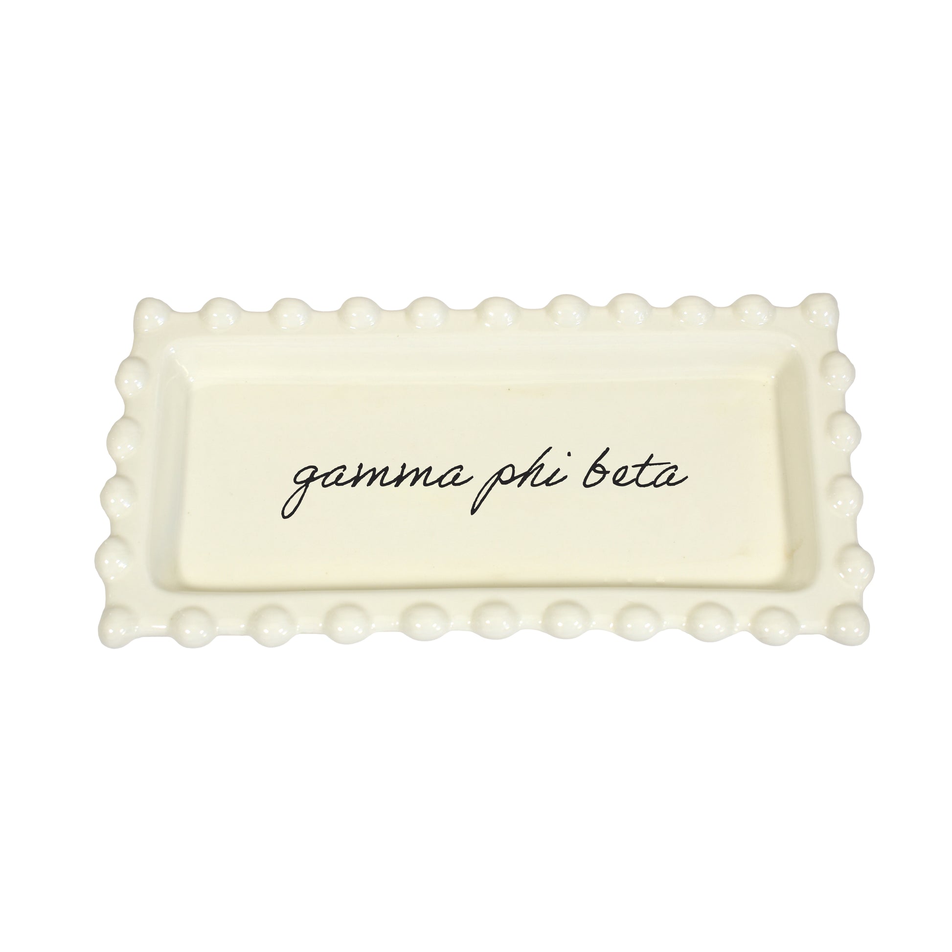 - SORORITY NAME IN CURSIVE SCRIPT: This Gamma Phi Beta jewelry dish boasts an attractive monochromatic look, proudly displaying your sorority name in cursive script.