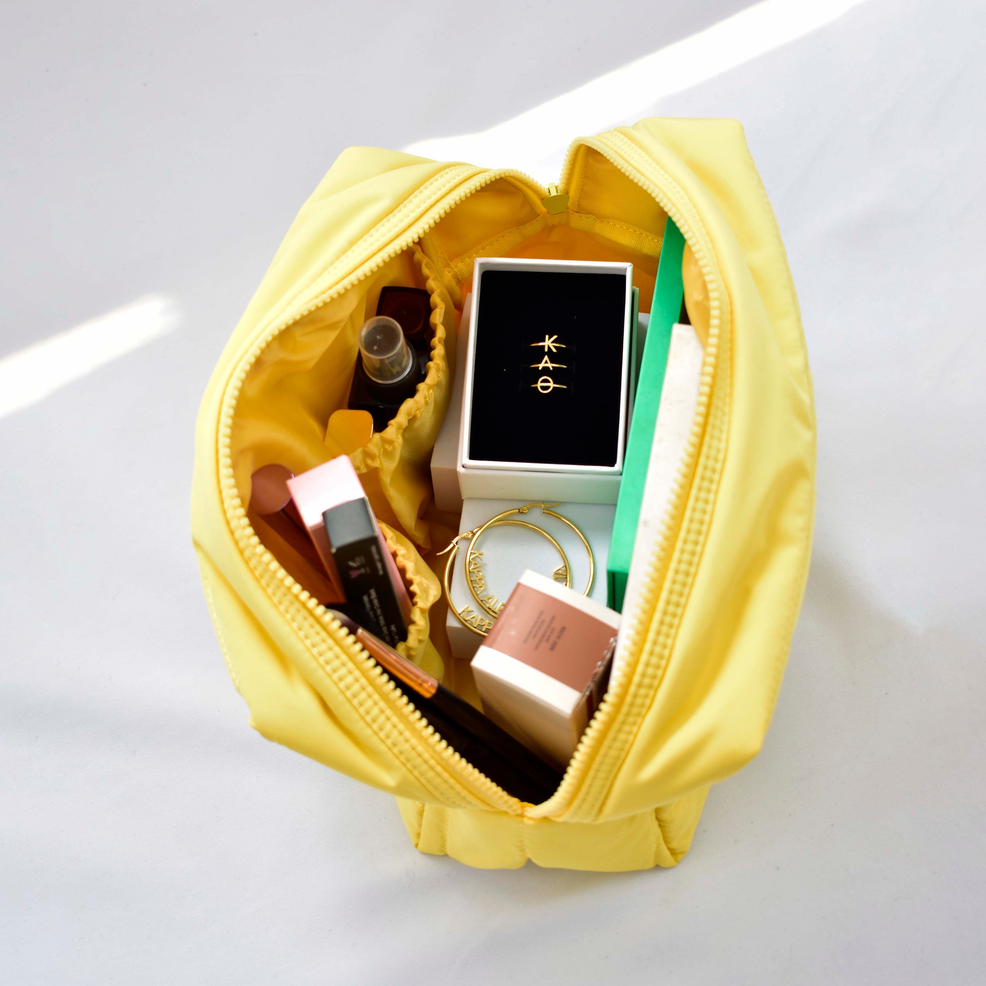 Crafted with a recycled polyester puffer-style exterior, this travel cosmetic bag has the look and feel of a comfy puffer jacket, and is built to last. The inside nylon lining compartments provide ample space to store your makeup, brushes, and other accessories. The padded quilted design not only looks cute but also helps protect the contents in your bag!