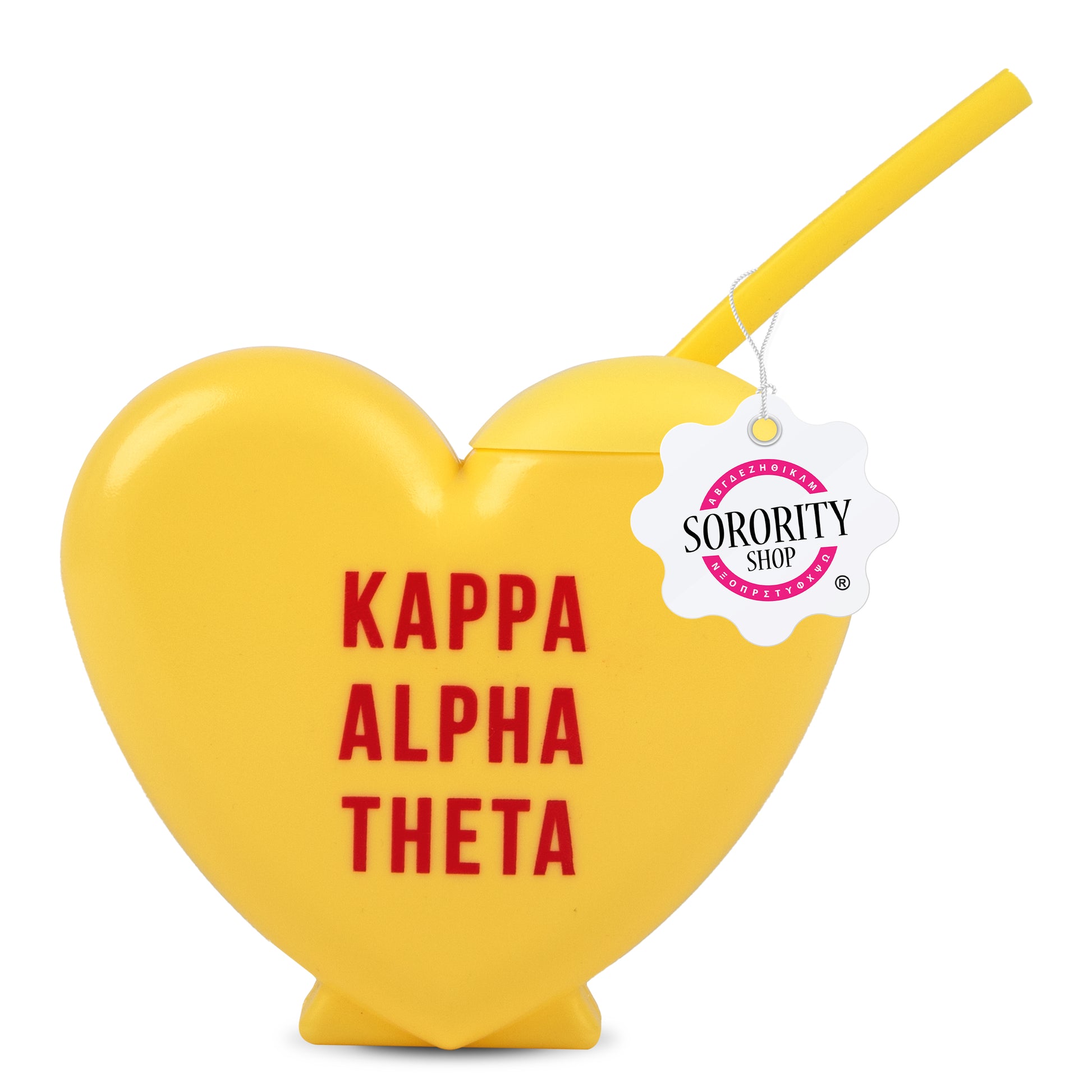 Modeled after the conversation heart candies we all adore, this new Tumbler is the perfect way to show your LOVE for your sorority! Our 16 oz. tumbler features a red logo printed on a Sorority color specific heart shaped BPA free plastic tumbler with screw on lid. The best part? Each tumbler includes a heart shaped silicone reusable straw!