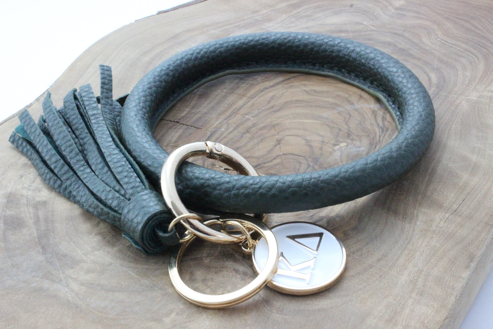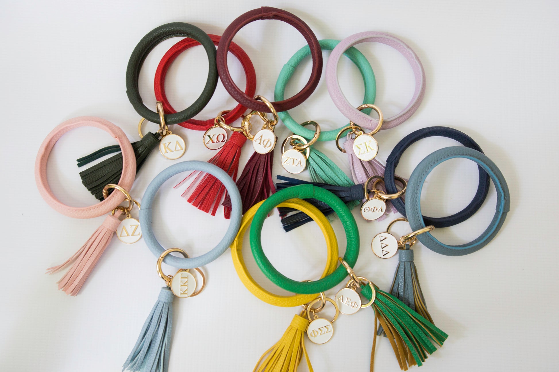 Our Sorority bangle keychains are perfect for the girl who's always got her hands full! Make your keys a new fashion accessory with this bangle keychain that can be worn on your wrist or attached to your bag. Our bangle is vegan leather wrapped with a decorative tassel and hinged clasp ring for your keys and comes with a white pendant with your sorority letters in gold print.