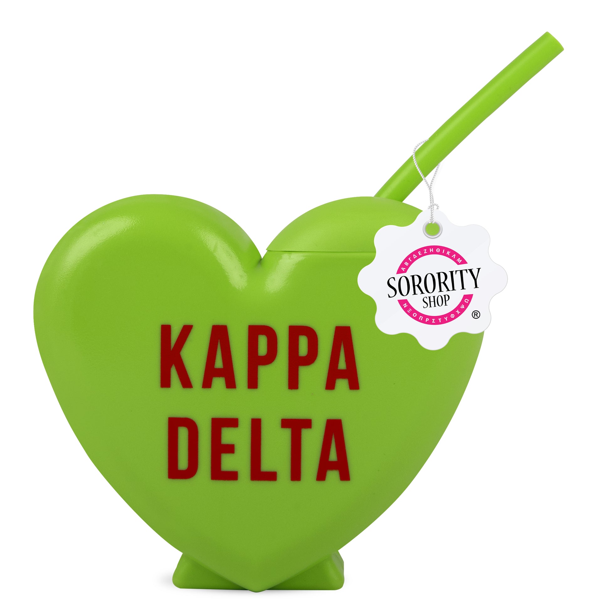 Modeled after the conversation heart candies we all adore, this new Tumbler is the perfect way to show your LOVE for your sorority! Our 16 oz. tumbler features a red logo printed on a Sorority color specific heart shaped BPA free plastic tumbler with screw on lid. The best part? Each tumbler includes a heart shaped silicone reusable straw!