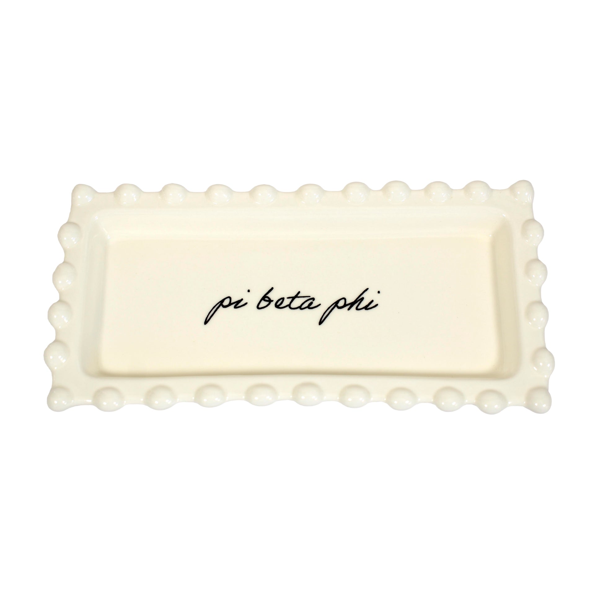 - SORORITY NAME IN CURSIVE SCRIPT: This Pi Beta Phi jewelry dish boasts an attractive monochromatic look, proudly displaying your sorority name in cursive script.