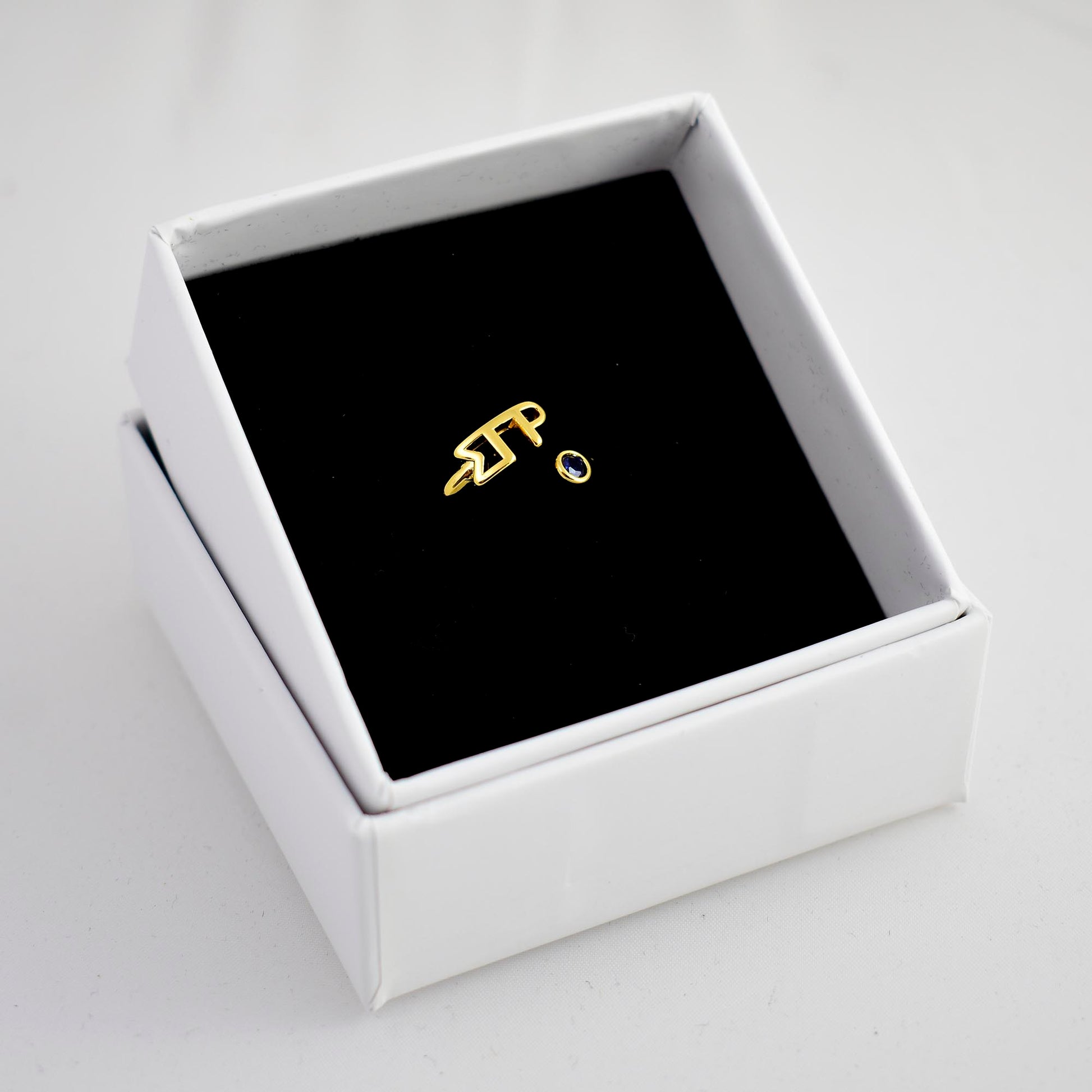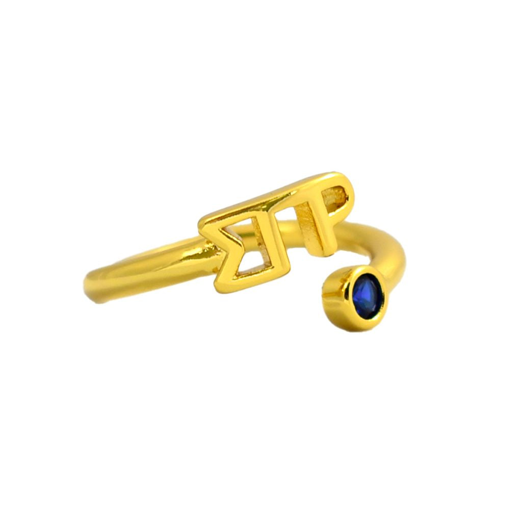 - SORORITY GREEK LETTER RING - Sorority pride is in the air! Show off your Sigma Gamma Rho sisterhood with this personalized wraparound ring. Proudly showing your Greek letters, plated in 18k gold and including a beautiful colored gemstone, they're perfect for continued wear at home or on campus.