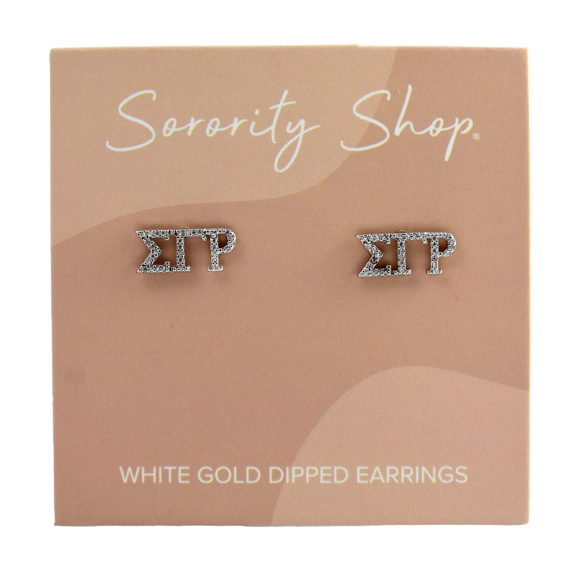 - STUD EARRING DESIGN – Our white gold-dipped Sigma Gamma Rho earrings are designed to make a statement. The Cubic Zirconia (CZ) studded sorority Greek letter earrings provide a unique look.