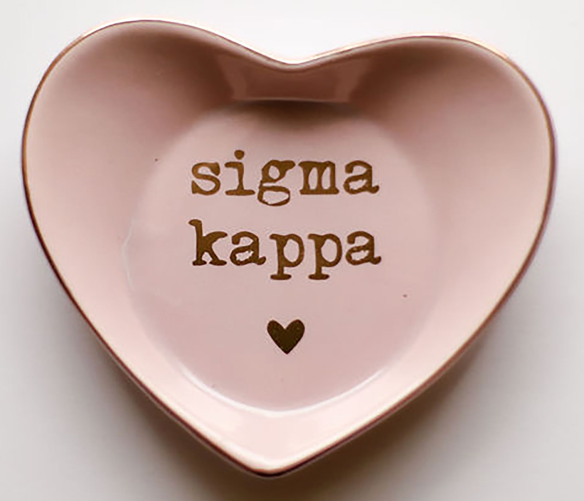 Our Sigma Kappa ceramic ring dish is the definition of chic with its high gloss finish and sorority name, heart and edge in gold. Great for rings, jewelry, keys or trinkets. Perfect for home or office!