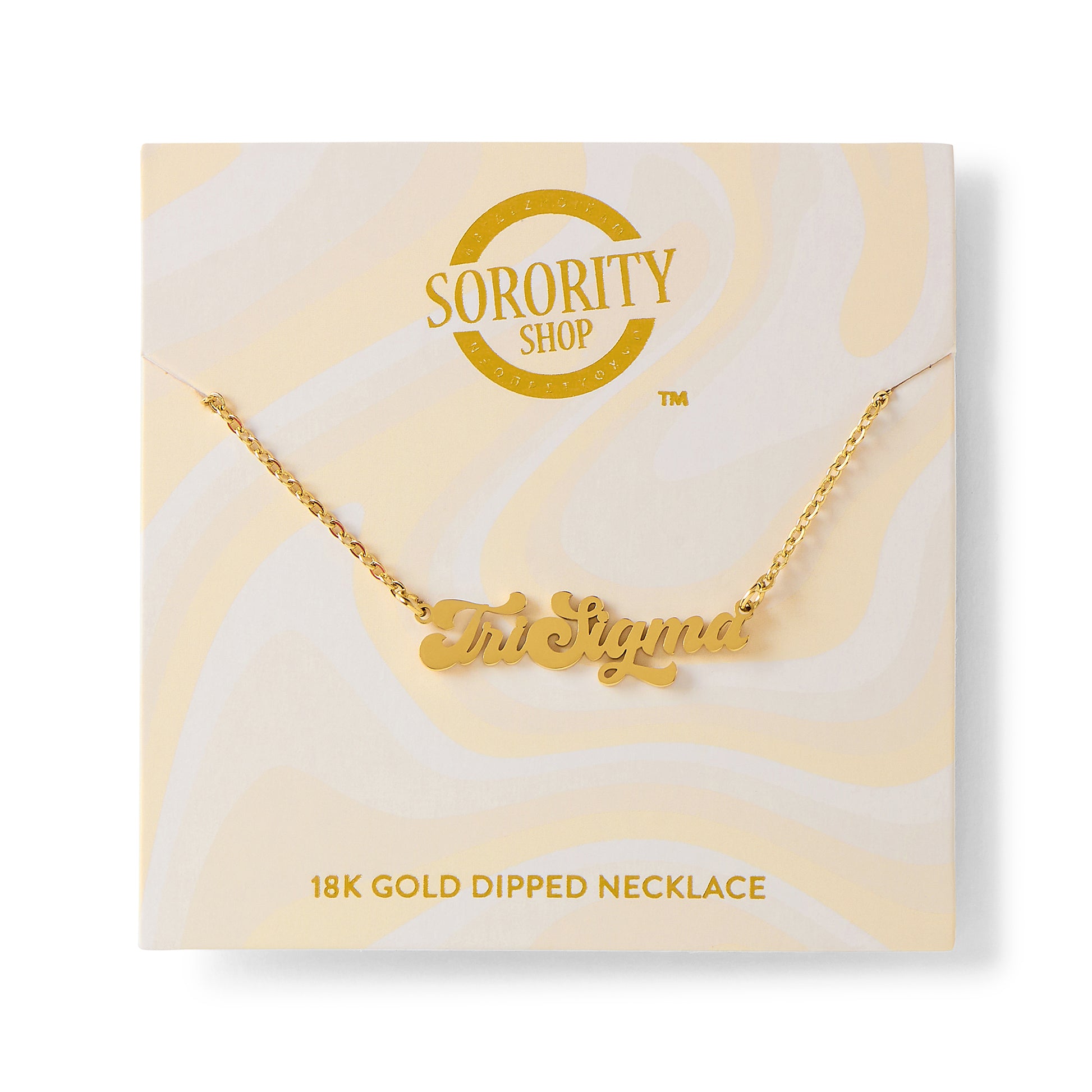 The perfect gift of Sisterhood! Our Sorority Sisterhood Retro Necklace features your sorority name or nickname dipped in 18k gold! This necklace comes with a perfectly giftable backer card with gold foil printing. Perfect for gifting. Perfect for a bid day gift, big little gift or a treat for yourself!