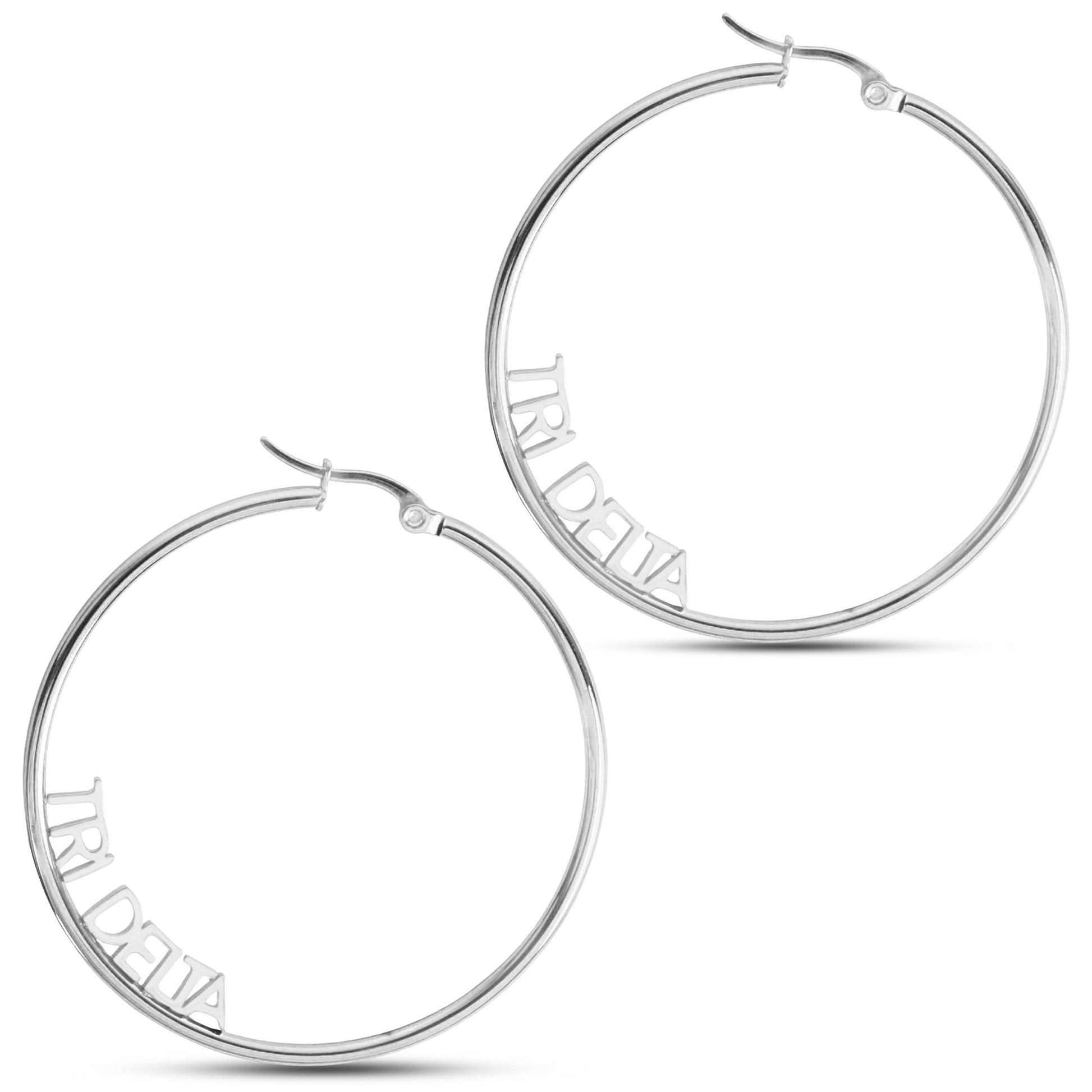 Our popular 2" hoops now available in Silver! Elevate your style with Tri Delta Silver-Plated Hoop Earrings. Show off your sisterhood with our captivating dainty earrings displaying your sorority name! Crafted with precision, these perfect-sized hoops are designed to turn heads and make a statement wherever you go.