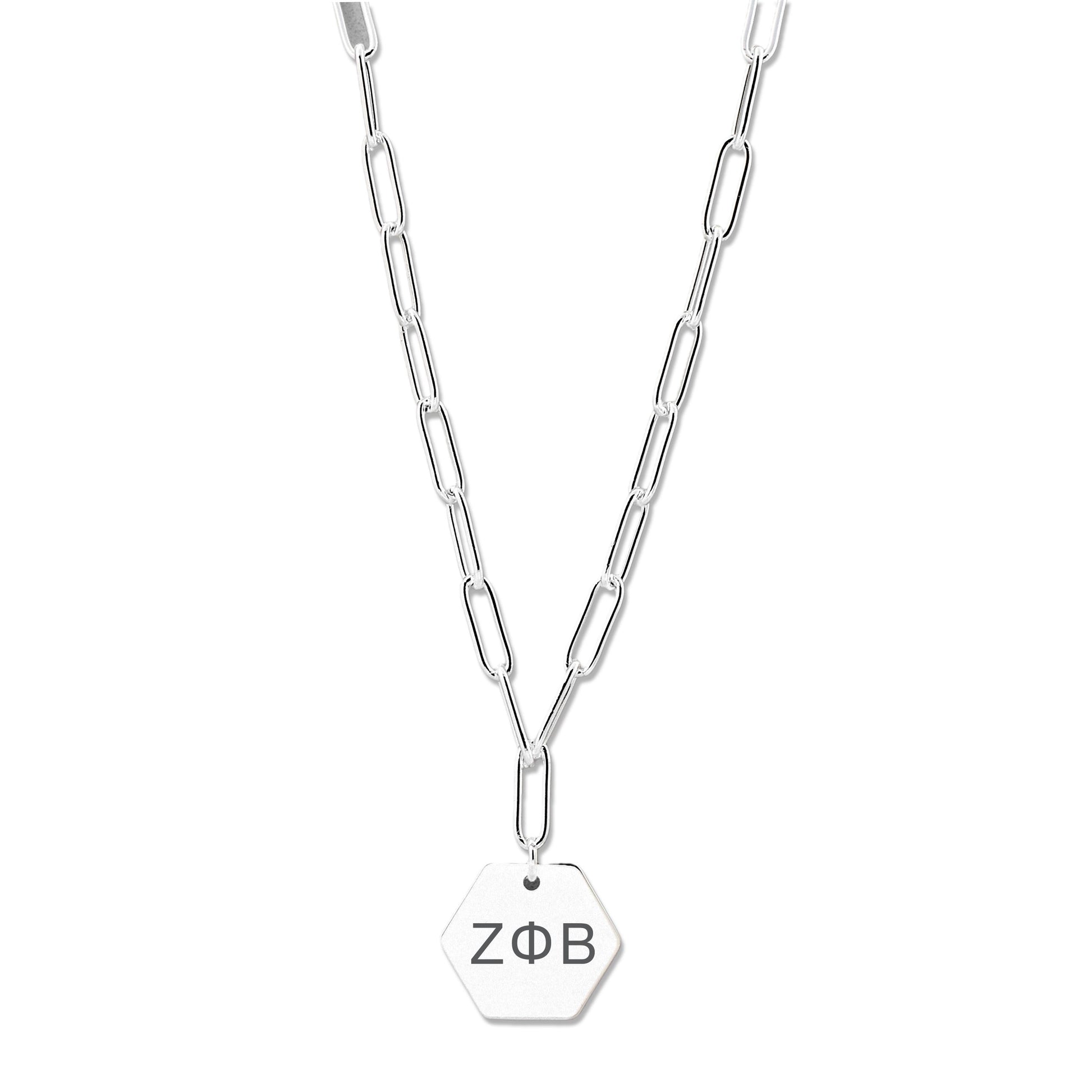 The perfect gift of Sisterhood! Our Zeta Phi Beta Necklace features your sorority's Greek letters on a 15mm hexagon shaped pendant, with a paperclip style chain, all dipped in silver! Perfect for a bid day gift, big little gift or a treat for yourself!