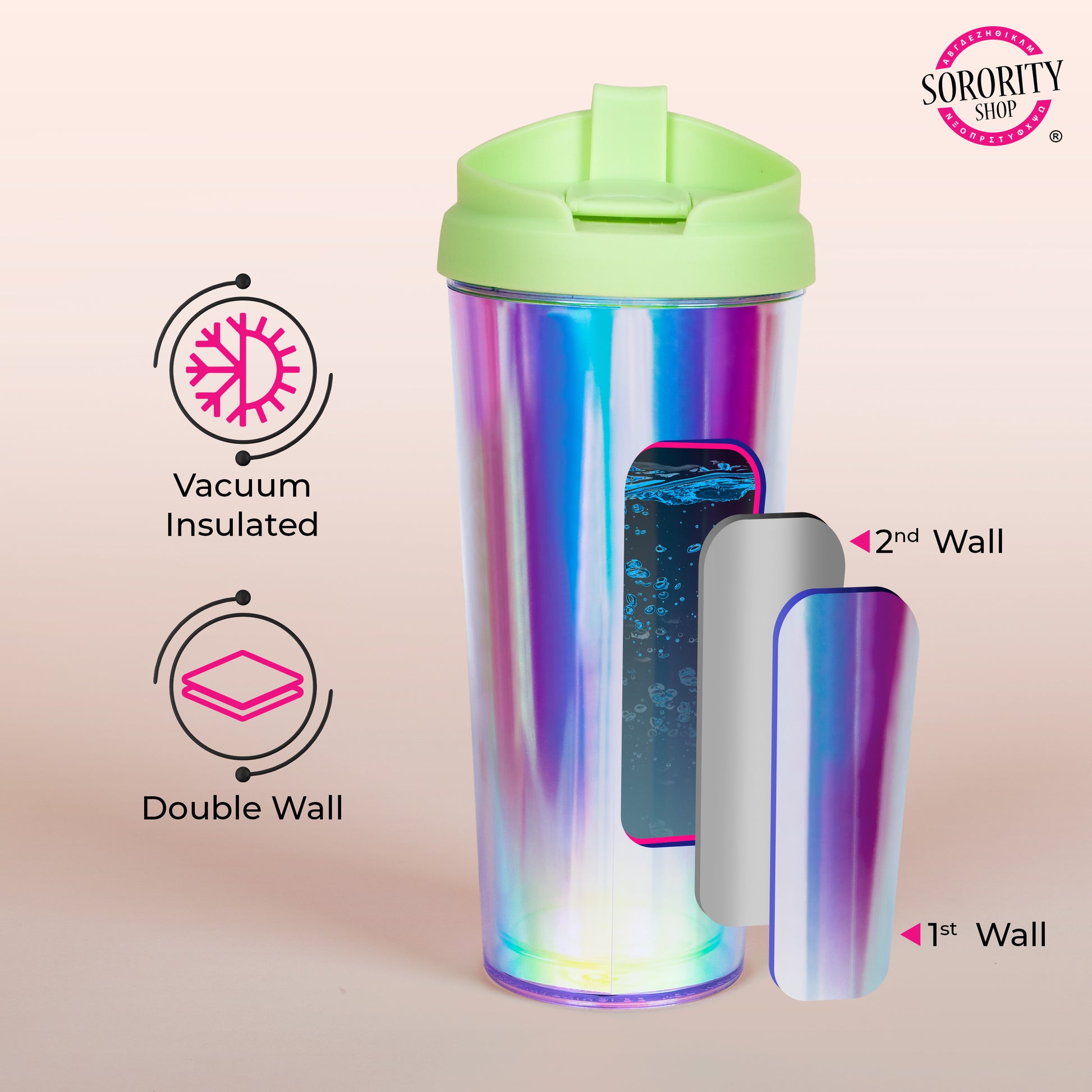 This new Tumbler is giving us all Retro Vibes! Our 16 oz. pastel/iridescent tumbler features a silk screened white logo and a Sorority specific lid with top closure.