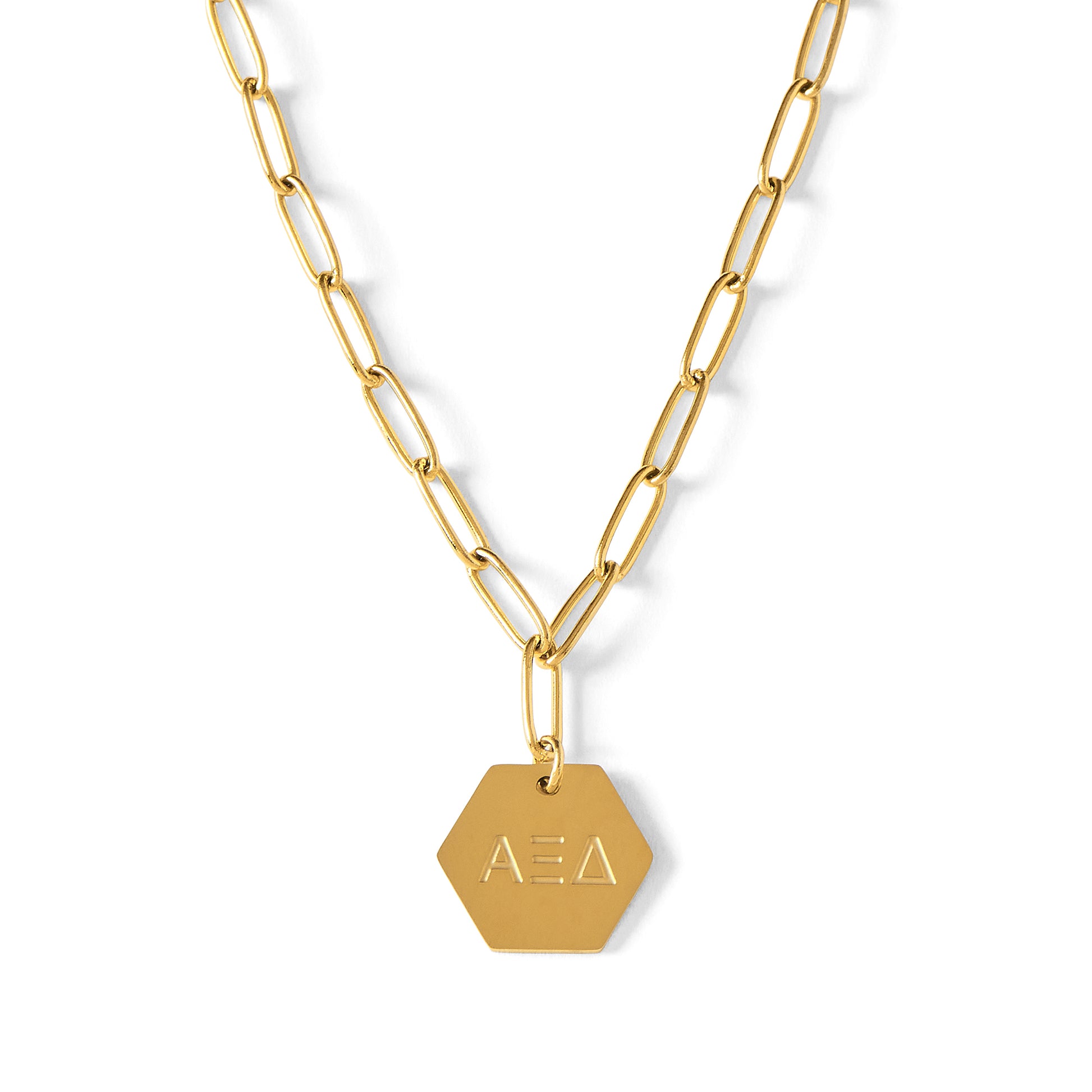 The perfect gift of Sisterhood! Our Paperclip Style Chain Sorority Necklace features your sorority's Greek letters on a 15mm hexagon shaped pendant, with a paperclip style chain, all dipped in 18K Champagne gold! Perfect for a bid day gift, big little gift or a treat for yourself!