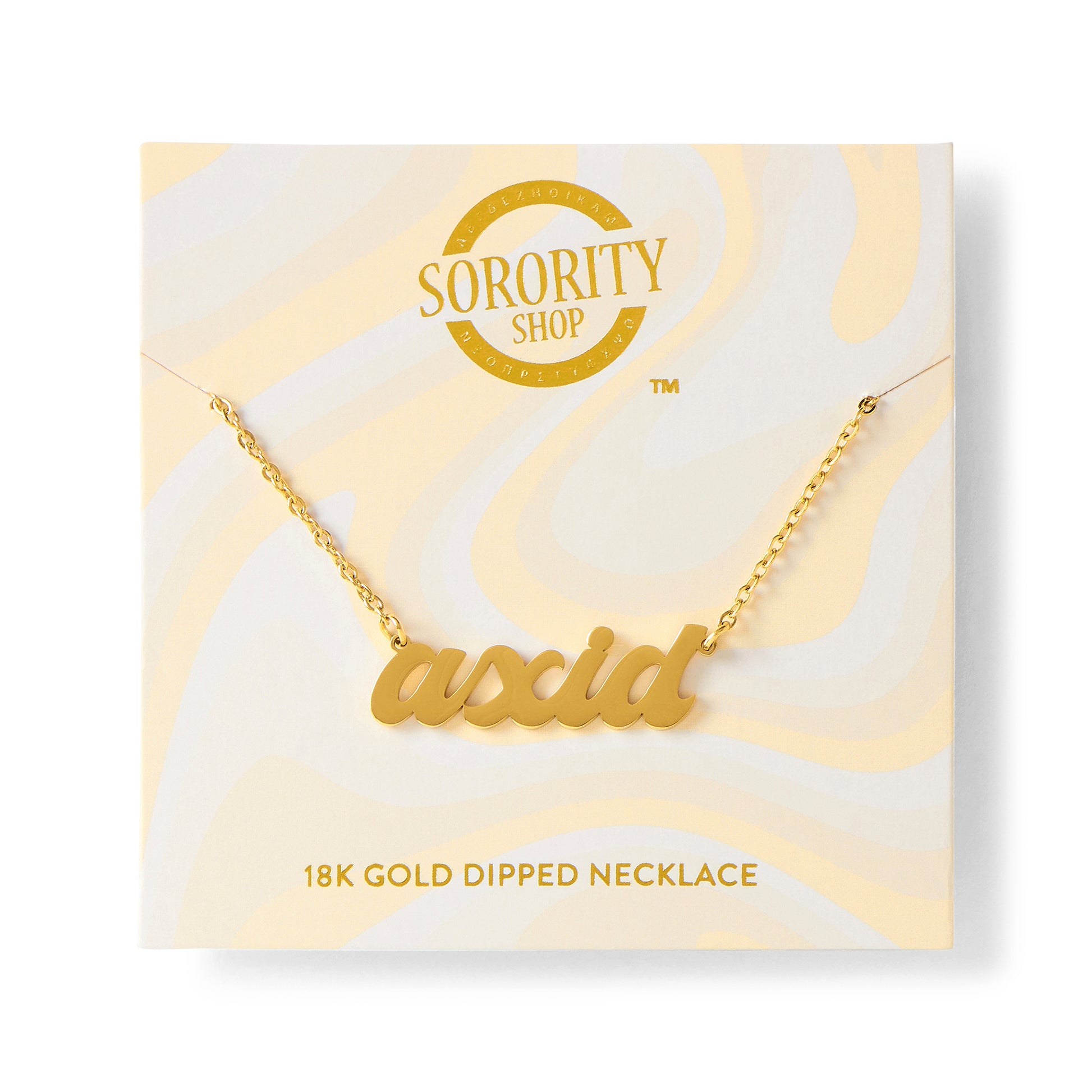 The perfect gift of Sisterhood! Our Sorority Sisterhood Retro Necklace features your sorority name or nickname dipped in 18k gold! This necklace comes with a perfectly giftable backer card with gold foil printing. Perfect for gifting. Perfect for a bid day gift, big little gift or a treat for yourself!