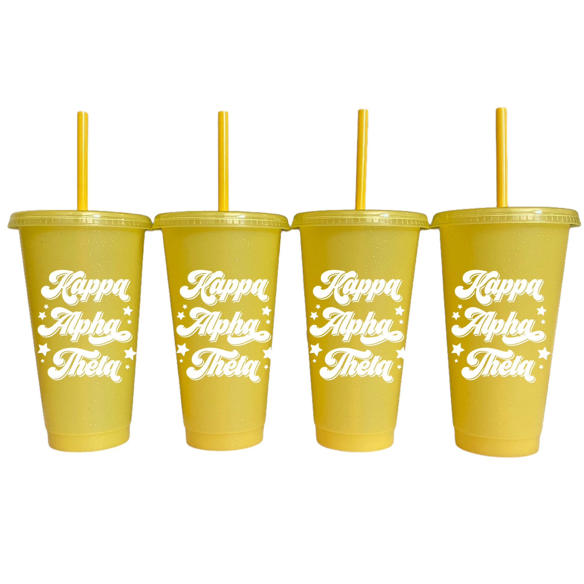 Take your sorority spirit on the road with our Set of 4 Glitter Color Changing Cups. Our 24-ounce reusable cups are made of magic! Each one changes color when filled with ice or your favorite cold beverage. Each package contains 4 Cups, 4 Lids, and 4 Straws. Each Cup has been screen printed with your sorority name in a cool Retro font. BPA Free.