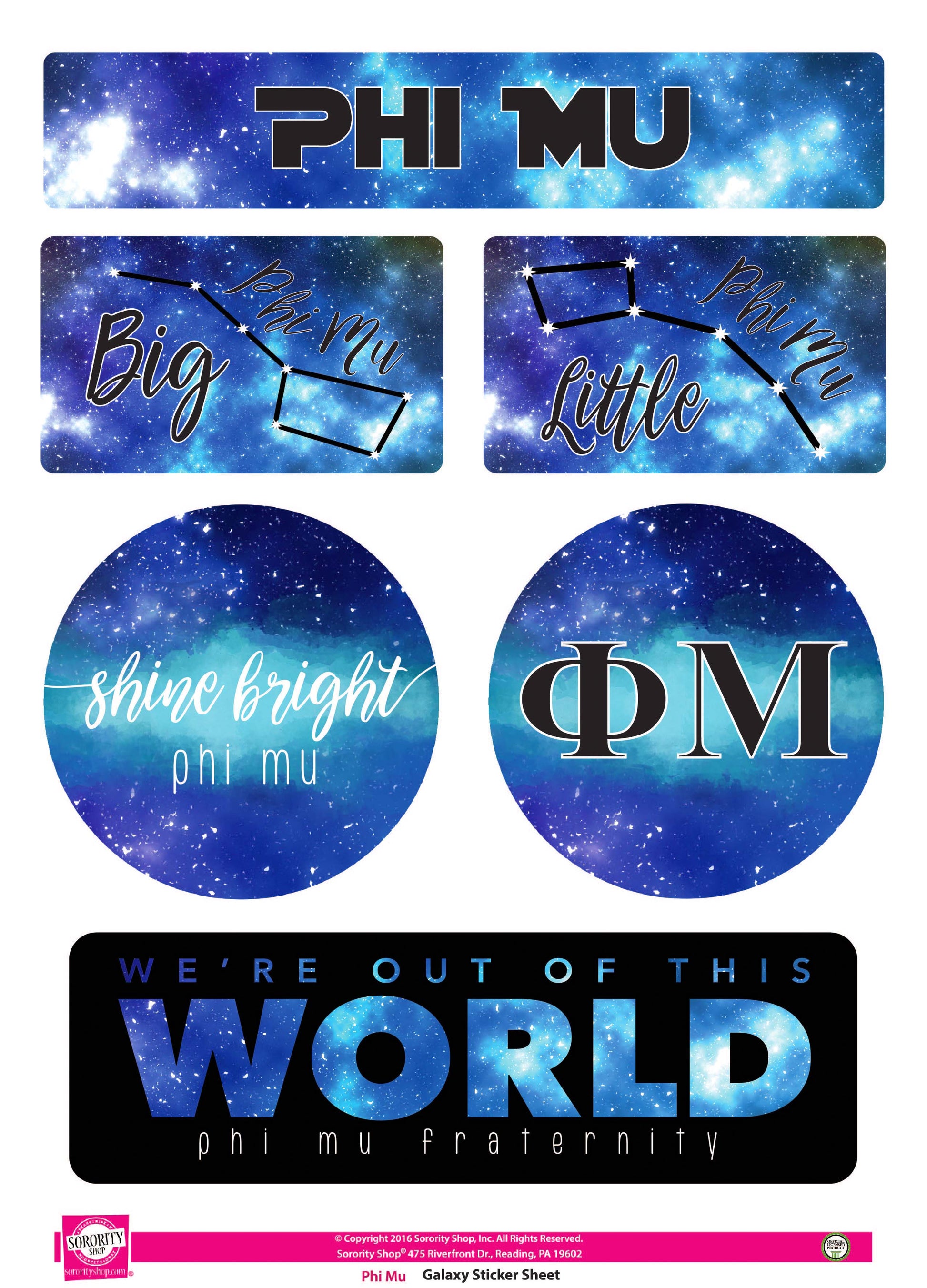 Get your "Greek On" with these high quality, Galaxy stickers! Each sheet contains 6 stickers ranging in size from a 2" circle to a generous 6.5"x 3" rectangle. Printed on sturdy vinyl, they are easily removed or repositioned leaving NO STICKY RESIDUE!