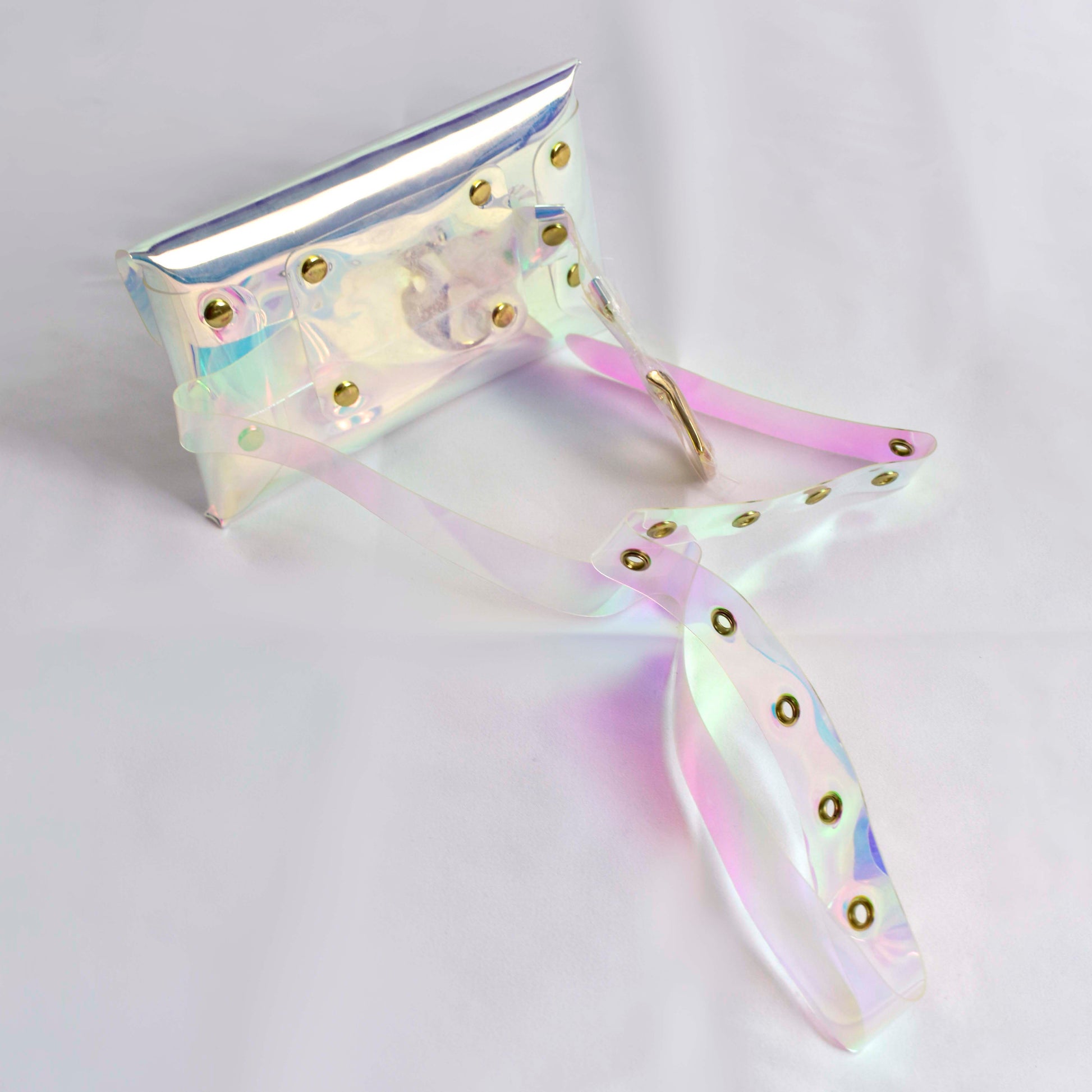 Our Holographic Belted fanny pack is sturdy, lightweight and comfortable to wear. The holographic material constantly changes color from every angle but is clear enough to be "stadium approved". The two compartment design has individual rainbow zippers and is roomy enough to hold ALL of your essentials. The strap with silver buckle is adjustable to give you just the fit you want! Measures 12.75 x 5 x 6.5 inches.