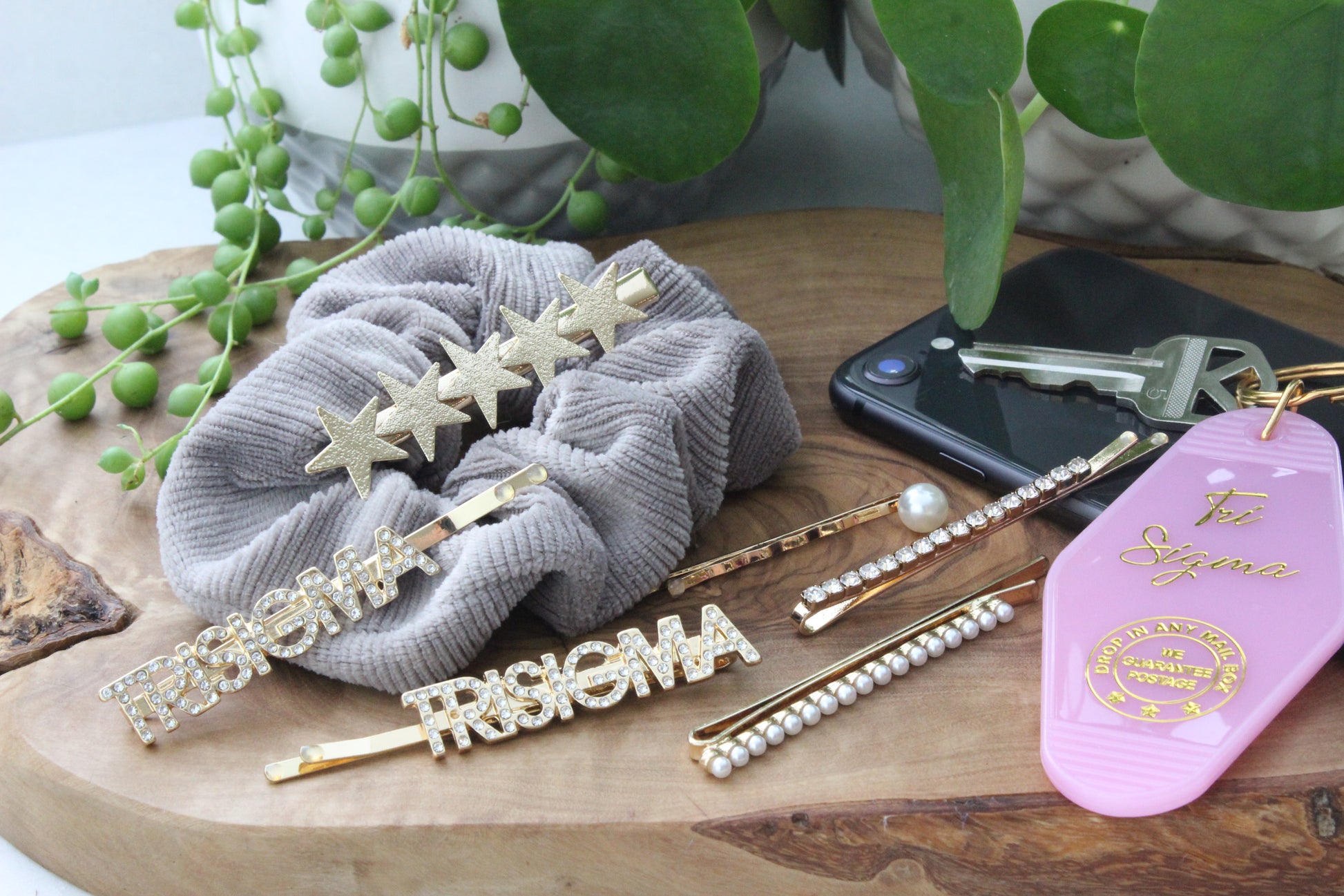 Our sorority hair clips will certainly add some spirited glam to your next function or night out! With 6 clips per pack (5 designs), you can get just the look you want at any time. Includes 2 rhinestone and gold Greek letter hair clips and 4 accompanying clips to compliment them.